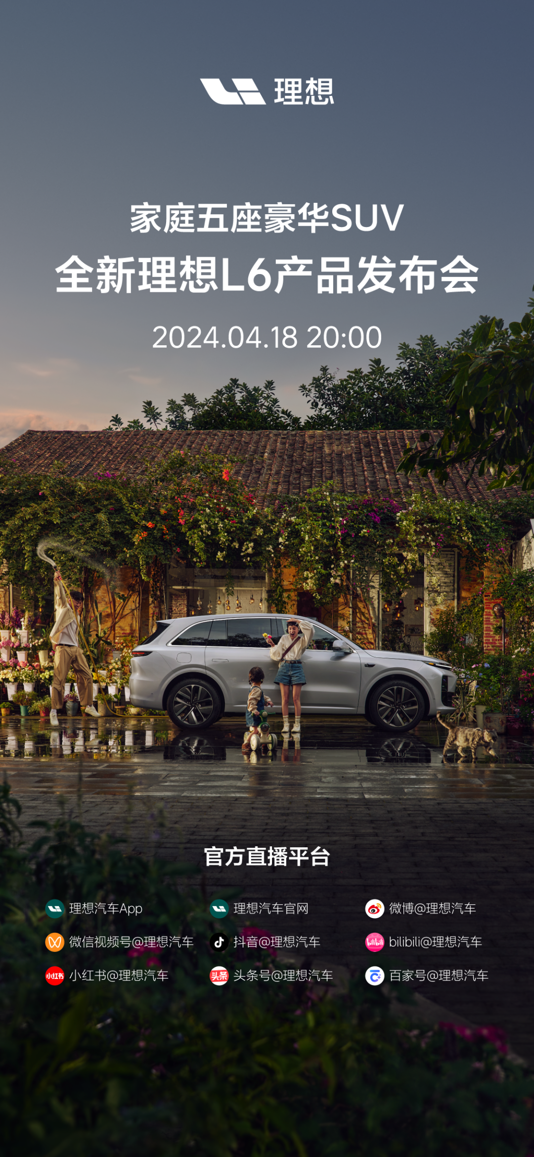 根据消息,理想汽车官方宣布,全新车型理想L6将于4月18日20点正式发布。该车定位为“家庭五座豪华SUV”,预计将成为理想汽车的一款重磅产品。