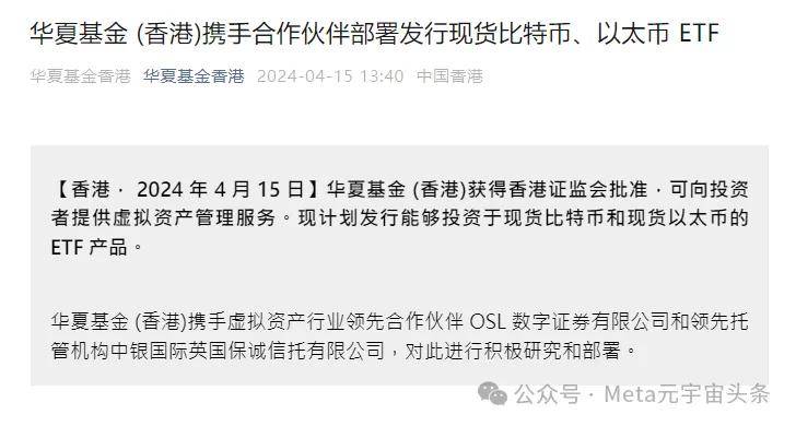 4月15日,华夏基金、博时资本和其他申请人在社交媒体平台微信上发帖称,他们已获准在香港上市比特币和以太坊ETF。消息推出后,比特币价格飙升至 66,000 美元以上。
