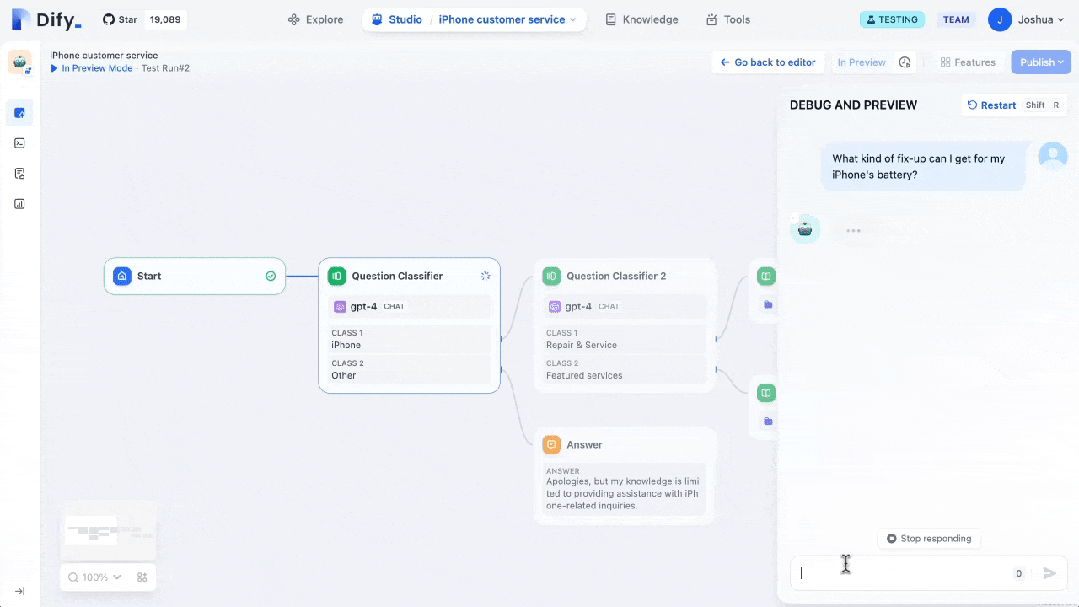 用户可以通过连接不同的节点,在一个无限的画布上构建自己的Workflow。