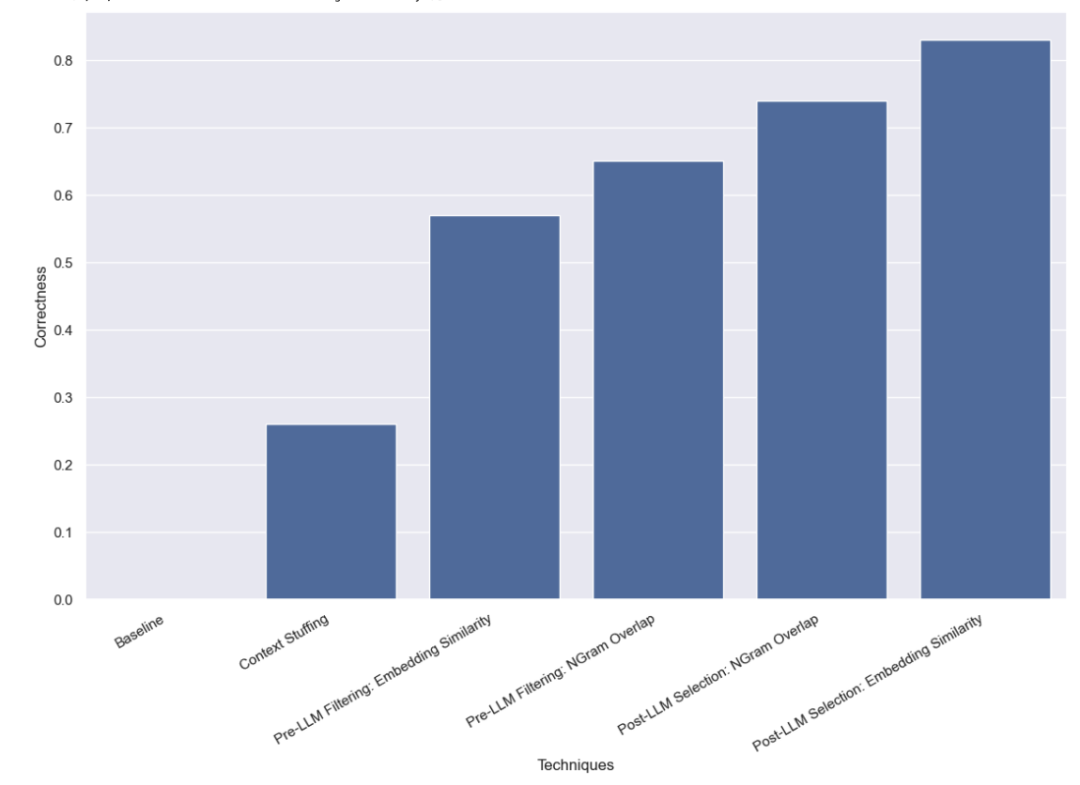 我们对处理高基数分类值的查询分析方法进行了多种基准测试。我们限制了自己只能进行一次LLM调用,这是为了模拟现实世界中的延迟限制。我们发现,使用LLM后基于嵌入相似性的选择方法表现最佳。