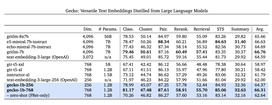 在 MTEB 基准测试中,使用 256 dims 输出的 Text-embedding-004(又名 Gecko)优于所有较大的 768 dims 输出模型