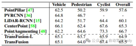 根据TransFusion的配置进行数据增强:使用范围为[-π/4,π/4]的随机旋转,随机缩放系数为[0.9,1.1],标准差为0.5的三轴随机平移和随机水平翻转,还在CBGS中使用类平衡重采样来平衡nuScenes的类分布。和TransFusion一样采用两阶段训练的方法,以TransFusion-L作为仅激光雷达训练的基线。使用单周期学习率策略的Adam优化器,最大学习率1×10−3,权衰减0.01,动量0.85 ~ 0.95,遵循CBGS。激光雷达基线训练为20轮,激光雷达图像融合为6轮,批量大小为16个,使用8个NVIDIA V100 GPU进行训练。
