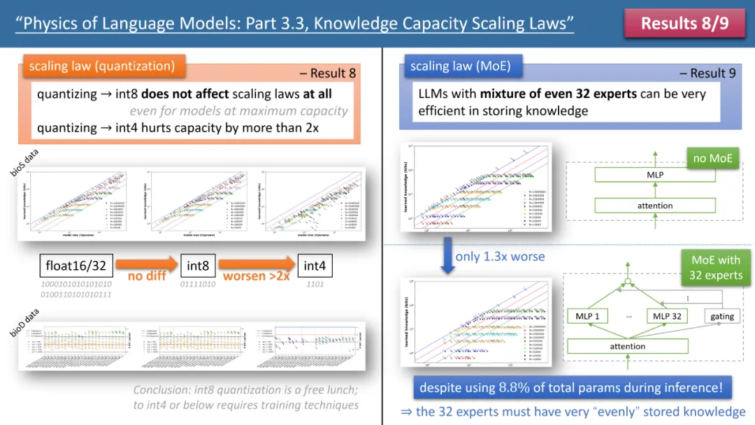 作者的定律 8 和定律 9 分别研究了 quantization 和 MoE 对模型 scaling law 的影响,结论如上图 3 所示。其中一个结果是,将训练好的模型从 float32/16 压缩到 int8,竟然对知识的存储毫无影响,即便对已经达到 2bit/param 存储极限的模型也是如此。