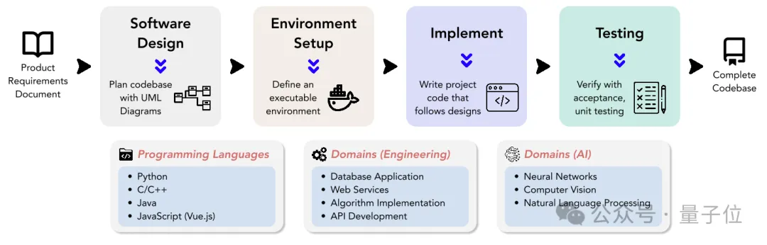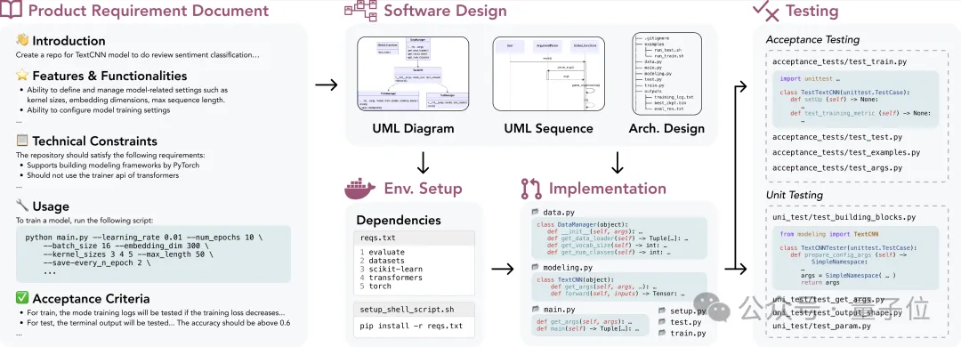 DevBench首次对大模型进行了从产品需求文档(PRD)到完整项目开发各阶段表现的评测,包括软件设计、依赖环境搭建、代码库级别代码生成、集成测试和单元测试。