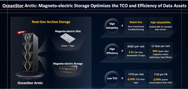 就能耗而言,华为的新型“磁电”存储技术也表现出色。据了解,每PB数据的存储耗电仅为71W,比传统磁性硬盘驱动器(HDD)节能效果高达90%。这一技术创新对于数据中心和大型企业来说将显著减少能源支出,降低运营成本。