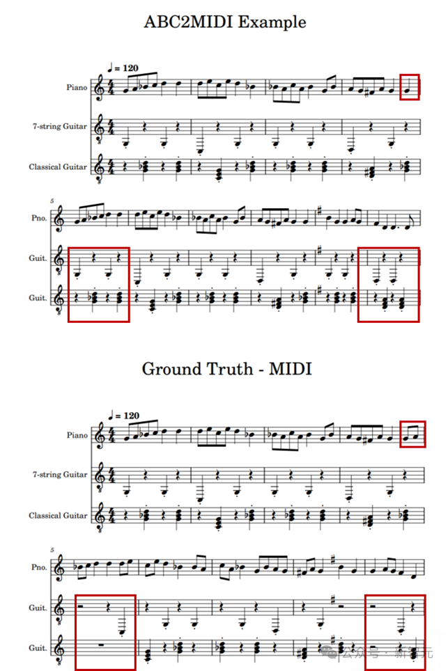 bGPT自动将ABC记谱法转换成MIDI格式(上图)与原MIDI数据(下图)的对比,凸显了关键的差异:虽然原MIDI数据中漏掉了一拍(见下图),导致和弦伴奏断开,但由bGPT转换的结果(见上图)正确填补了这一缺失,确保了和弦伴奏的流畅性。