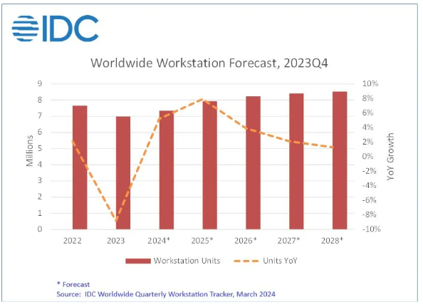 展望未来,IDC预测,随着市场补充库存和为更新项目做准备,2024年工作站出货量将增长5.2%。这一增长势头有望持续到2025年,届时增长率将达到7.9%。然而,到2025年末,随着Windows 11迁移冲刺的结束,增长速度可能会有所放缓。但在2022-2028年的预测期内,市场的五年复合年增长率(CAGR)仍将达到2%,显示出工作站市场的长期增长潜力。