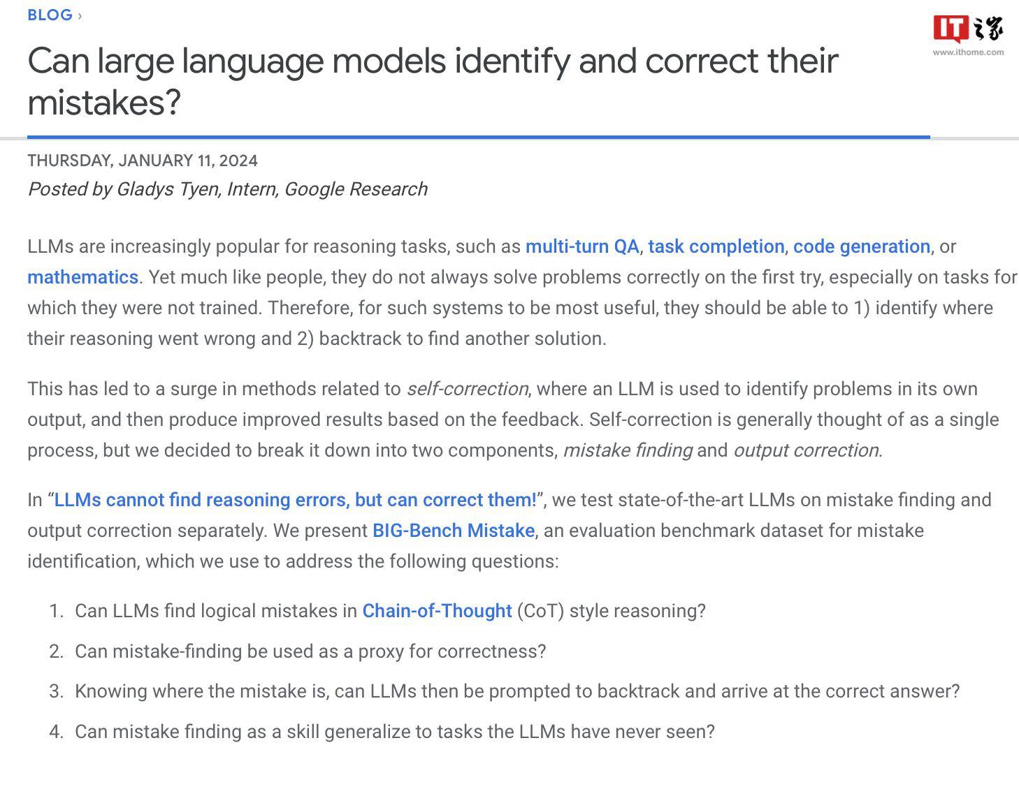 谷歌研究院最近针对流行的语言模型进行了一项评估研究,使用了自家的BIG-Bench基准测试和新建立的“BIG-Bench Mistake”数据集。他们主要关注了语言模型的出错概率和纠错能力。这个研究为了更好地了解市面上的语言模型的性能表现,提供了有价值的数据。