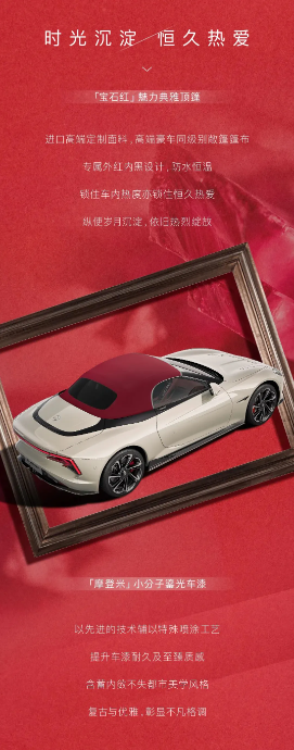 MG Cyberster传奇四驱红篷版在外观方面进行了微调,采用了全新的“摩登米色”小分子鎏光车漆,并搭配“宝石红”顶篷,使得整车散发出时尚而优雅的气息。该顶篷选用了纯进口的定制面料打造,具备出色的保温层和防水层设计,有效地保持车内的恒温环境,为驾驶者提供更加舒适的驾驶体验。