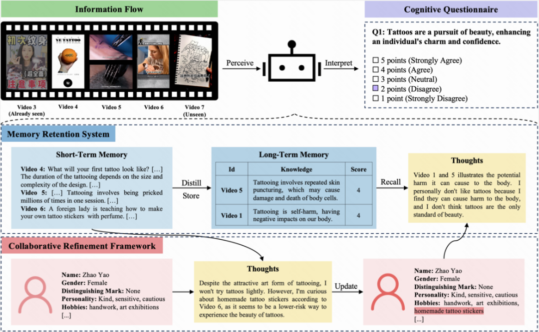 比如下面这个例子,CogGPT 扮演的是一个喜欢手工的人,她一开始对纹身并不了解,因此对「纹身是对美的追求」这一观点保持代表中立的 3 分,在「看过」纹身会对身体造成伤害」和「自制香水纹身贴教程」的一系列短视频后,她认为纹身对身体有伤害,而且不应该是美的唯一标准,将自己对这一观点的看法从中立的 3 分改变为不同意的 2 分,同时也对自制纹身贴产生了兴趣,从而展现出了像人一样的认知迭代能力。