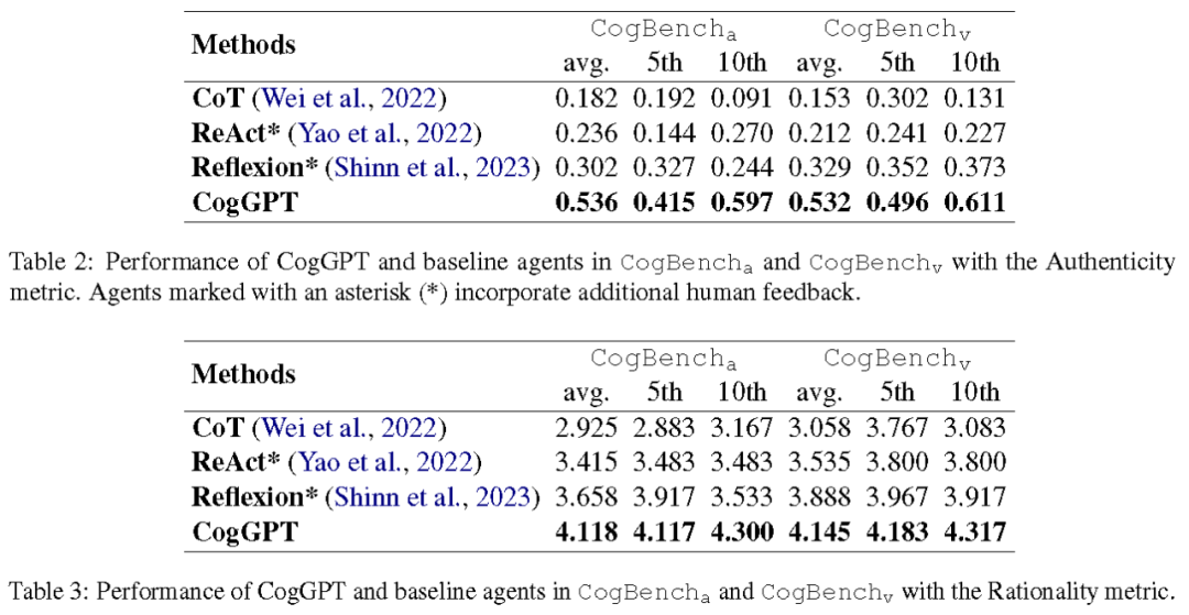 研究团队还对 CogGPT 和一些通用基线在 CogBench 上做了充分实验。实验结果表明,在 CogBench_a 和 CogBench_v 两个基准上,CogGPT 在真实性(Authenticity)和合理性(Rationality)这两个核心评估指标上的表现都远超现有方法,这也进一步证明了 CogGPT 可以有效地模仿特定人设的认知迭代过程。