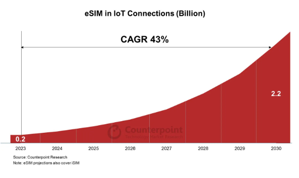 市场研究机构Counterpoint Research最近发布了一份报告,预测到2030年,通过eSIM技术连接网络的物联网设备数量预计将达到22亿台。这一预测显示出了巨大的增长潜力,年复合增长率高达43%。这一趋势表明,eSIM技术在物联网领域的应用将会迅速增长,并且成为未来物联网发展的关键驱动力之一。随着eSIM技术的不断普及和发展,各种类型的智能设备将更加便捷地连接到网络,为用户带来更加智能、高效的体验。2030年的22亿eSIM连接的设备数量也反映出了未来物联网市场的巨大潜力和机遇。这一预测