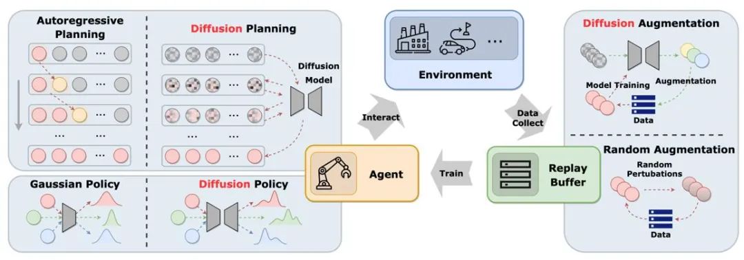 图中展示了扩散模型在经典智能体-环境-经验回放池循环中的作用。与传统解决方案相比,扩散模型为系统引入了新的元素,提供了更全面的信息交互和学习机会。通过这种方式,智能体能够更好地适应环境变化,并且优化其决策