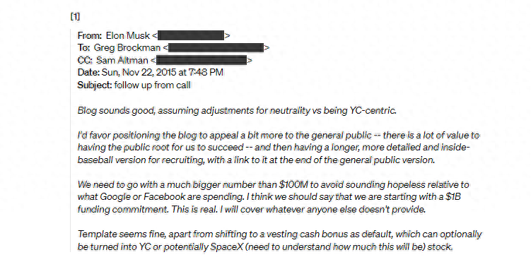 马斯克曾表示愿意向 OpenAI 提供初始资金10亿美元的承诺,强调在邮件中说“其他人不提供的,我都会承担”。然而,OpenAI 实际上只从马斯克那里筹集了不到4500万美元,超过9000万美元的资金则是来自其他捐赠者。