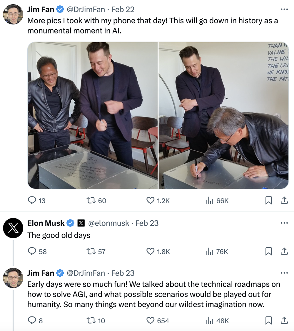 随后英伟达高级研究科学家 Jim Fan 发推文回忆这段“美好的旧时光”:“我第一次见到黄仁勋,也是我第一次见到埃隆・马斯克。那天我在 OpenAI 实习,亲眼见证黄仁勋将第一台 DGX 交给埃隆的那一刻。我塞进了我的签名。”