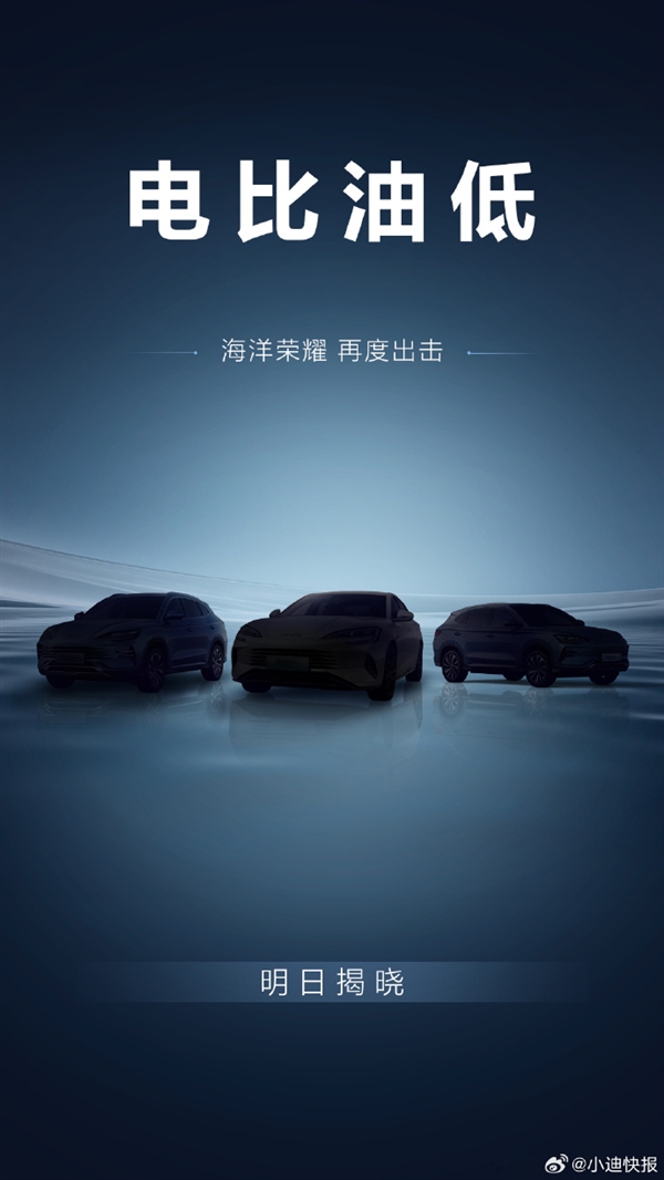 昨晚,知名博主“小迪快报”在社交媒体上预热了这一重大消息,他发布了一张海报并配文:“海洋荣耀,继续出击!三车荣耀报到,惊喜明天揭晓。”海报中隐约可见三款车型的剪影,经过亮度调整,可以清晰地辨认出它们分别是海豹DM-i荣耀版、宋PLUS DM-i荣耀版以及宋PLUS EV荣耀版。