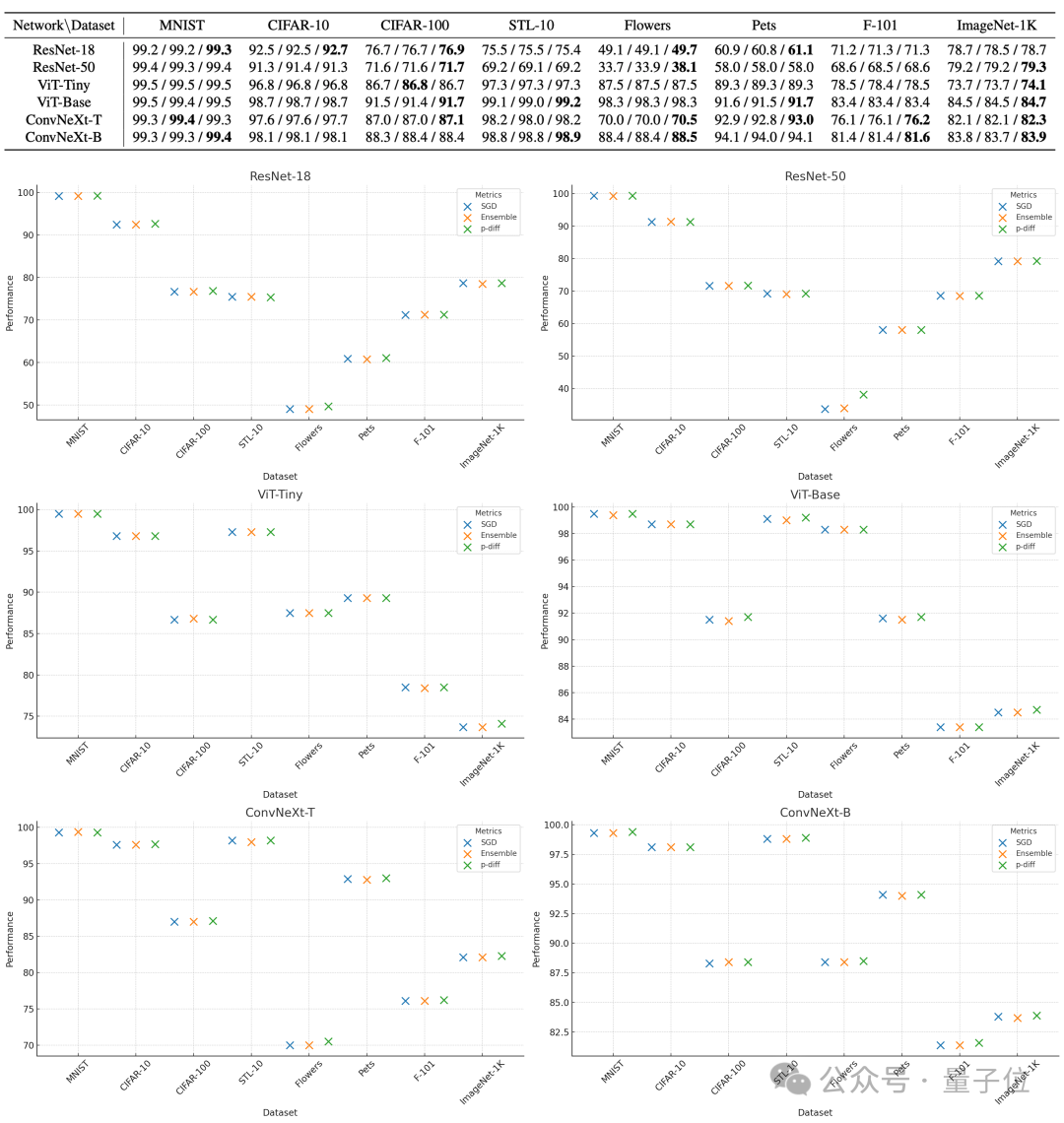 为了评估p-diff所生成参数的质量,研究人员利用3种类型、每种两个规模的神经网络,在8个数据集上对其进行了测试。