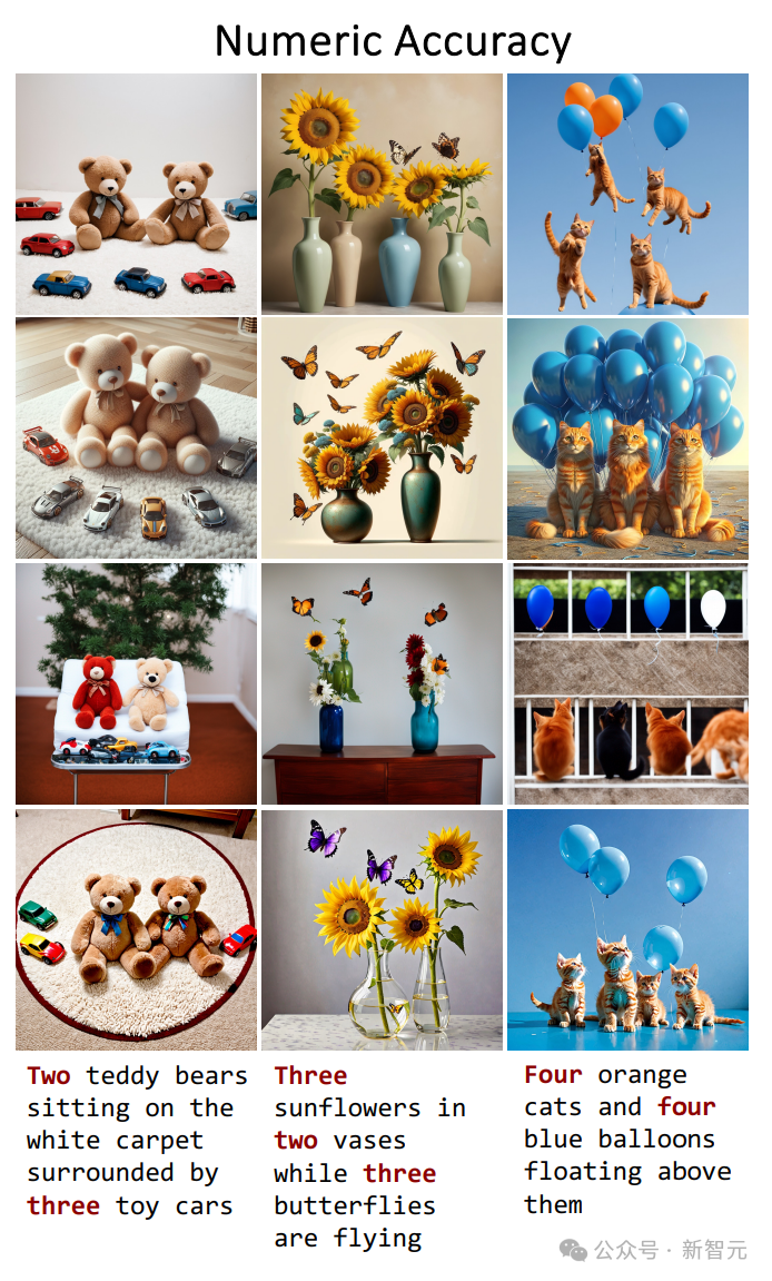 然后是数值准确性,展示顺序同上(SDXL、DALL·E 3、LMD 、RPG):