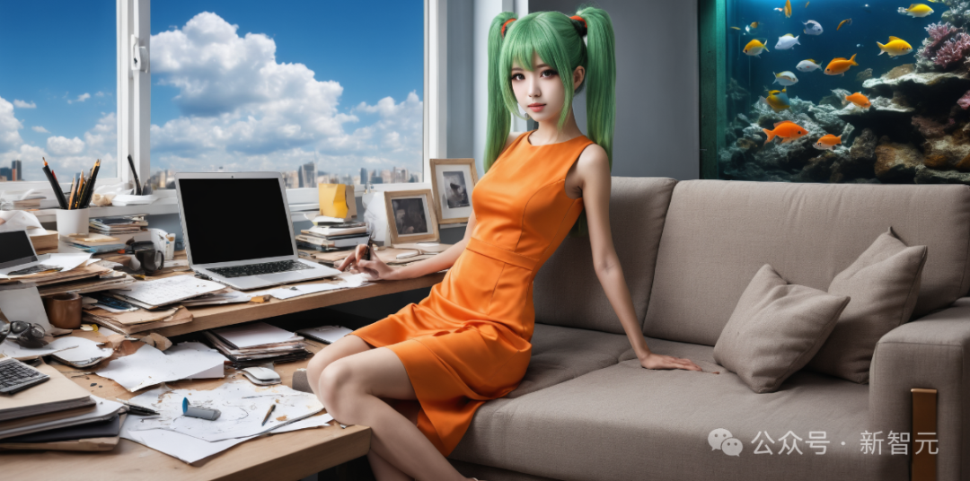 一个穿着橙色连衣裙的双马尾女孩坐在沙发上,大窗户旁是凌乱的办公桌,右上方摆放着一个活泼的水族馆,房间风格现实主义。