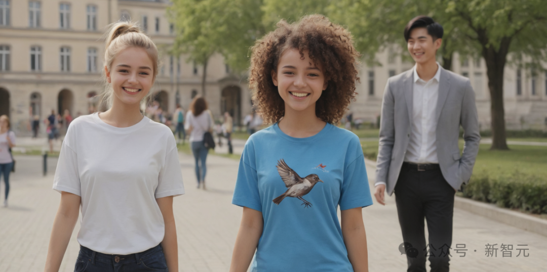从左到右,一个穿着白色衬衫、扎着金发马尾辫的欧洲女孩,一个穿着印着小鸟的蓝色衬衫、棕色卷发的非洲女孩,一个穿着西装、黑色短发的亚洲年轻人正开心地在校园里散步。