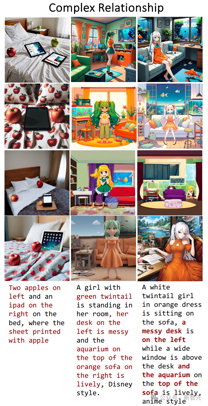 我们来看一下生成效果在以上三个方面的表现,首先是属性绑定,对比SDXL、DALL·E 3和LMD :