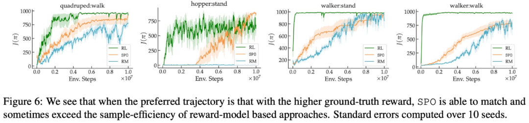 该研究在一系列具有现实偏好函数的连续控制任务上,证明了 SPO 比基于奖励模型的方法性能更好。SPO 在各种偏好设置中能够比基于奖励模型的方法更有效地学习样本,如下图 2 所示。