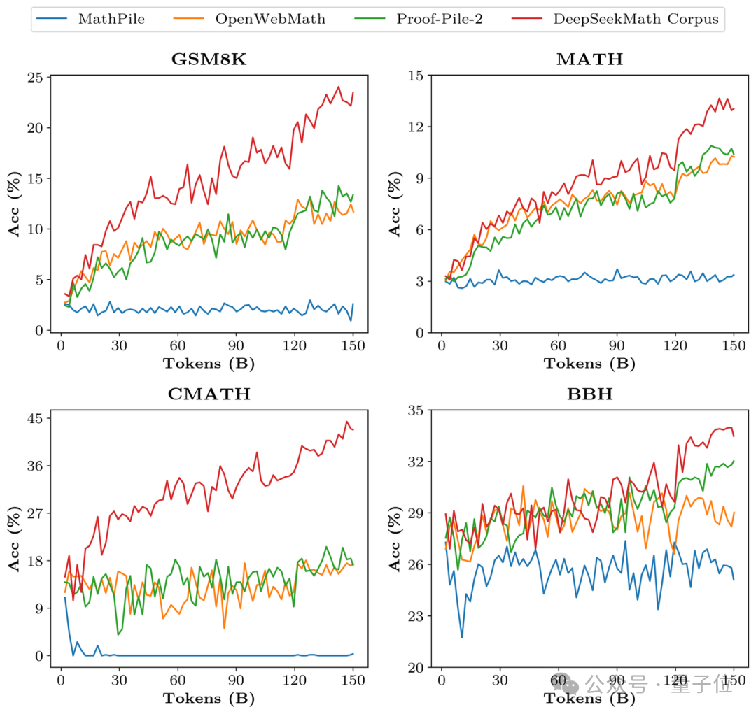 为了验证DeepSeekMath Corpus的数据质量,研究团队分别用MathPile等多个数据集训练了1500亿token,结果Corpus在多个数学基准上效果明显领先。