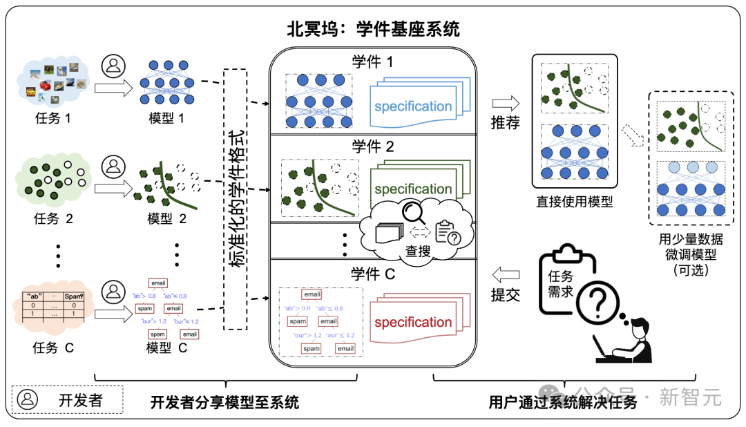 在学件范式下,世界各地的开发者可分享模型至学件基座系统,系统通过有效查搜和复用学件帮助用户高效解决机器学习任务,而无需从零开始构建机器学习模型。