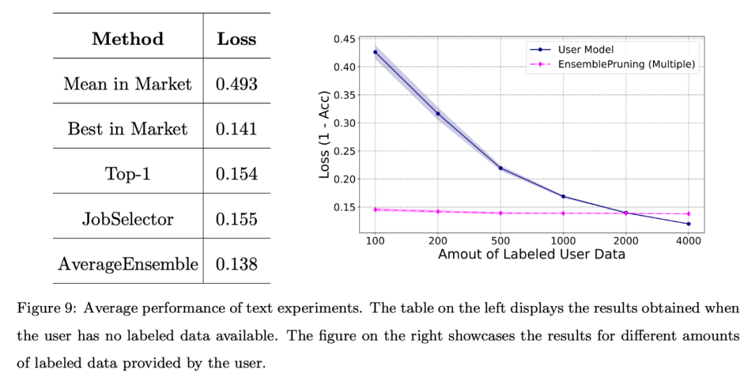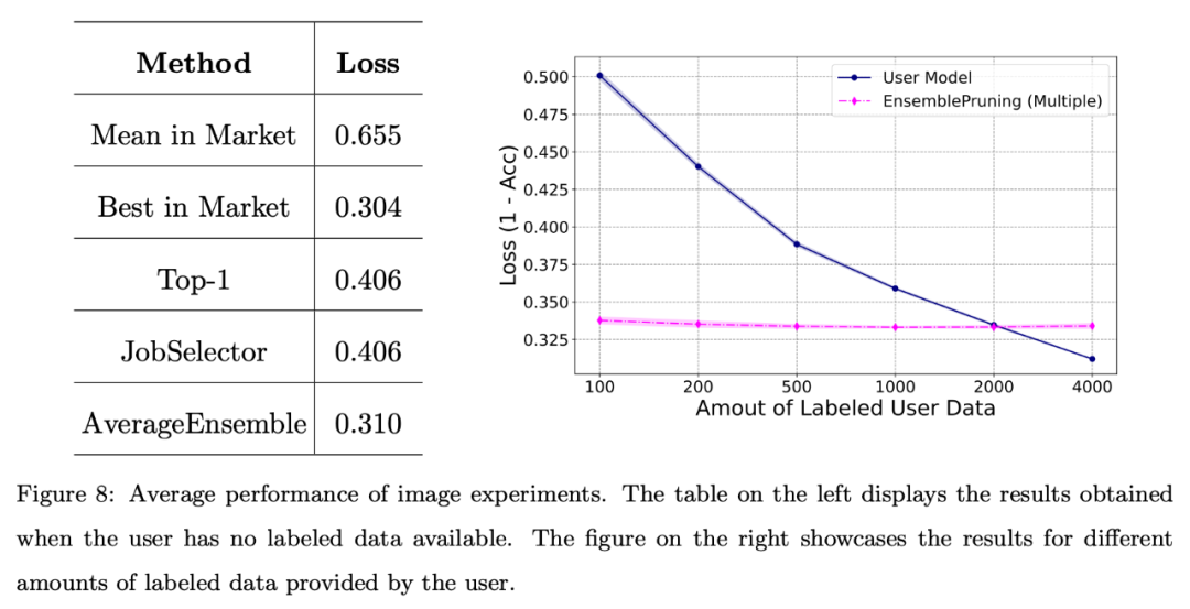 当用户没有标注数据或标注数据量有限时,团队对不同的基准算法进行了比较,所有用户的平均损失如下图所示。左表显示,无数据方法比从市场上随机选择和部署一个学件要好得多;右图表明,当用户的训练数据有限时,识别并复用单个或多个学件比用户自训练的模型性能更优。