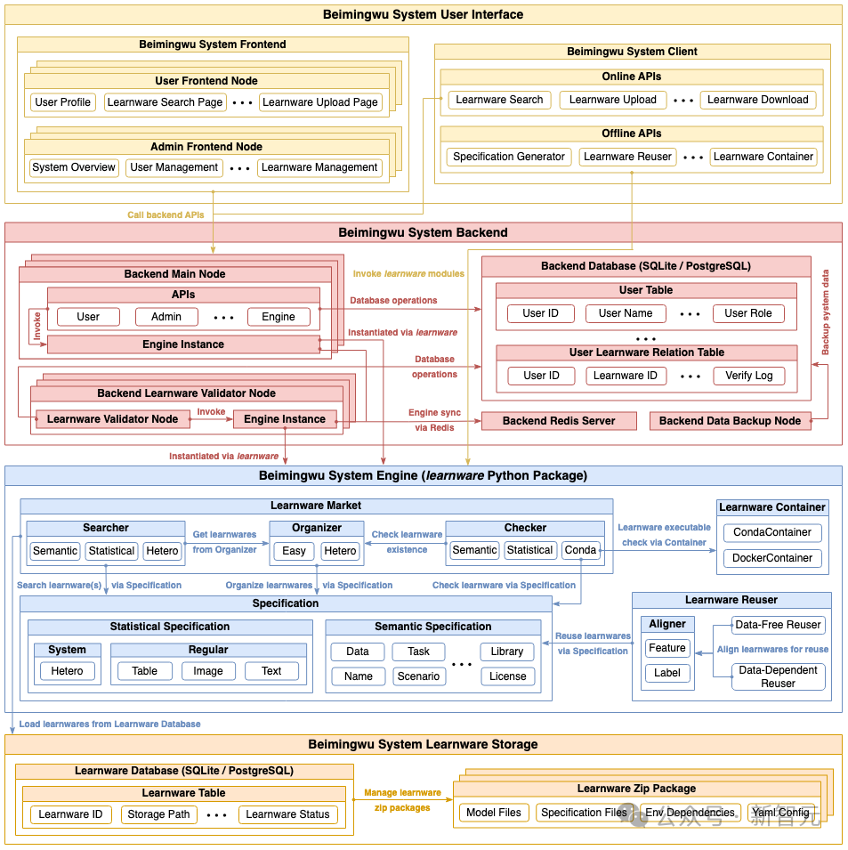 - 系统引擎层:囊括了学件范式中的所有流程,包括学件上传、检测、组织、查搜、部署和复用,并以learnware Python包的形式独立于后端和前端运行,为学件相关任务和科研探索提供了丰富的算法接口;