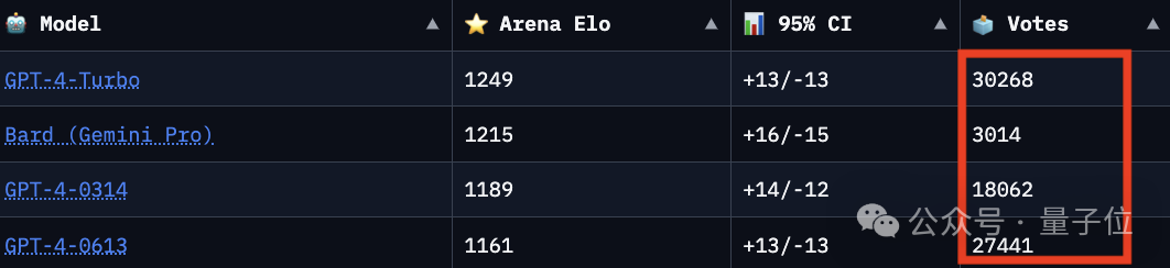 相较而言,GPT-4 Turbo的票数已经达到了30000 ,被超越的两个版本的票数也都是Bard的数倍。