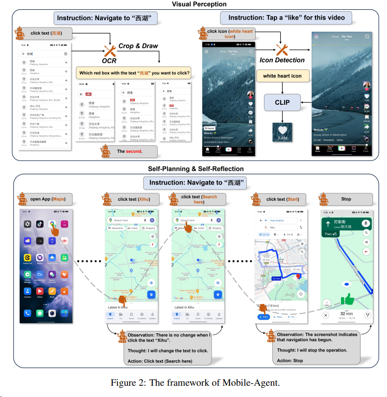 MobileAgent利用视觉感知工具准确识别和定位应用程序前端界面的视觉和文字元素,实现了自主规划和分解复杂操作任务,通过逐步操作导航移动应用程序。
