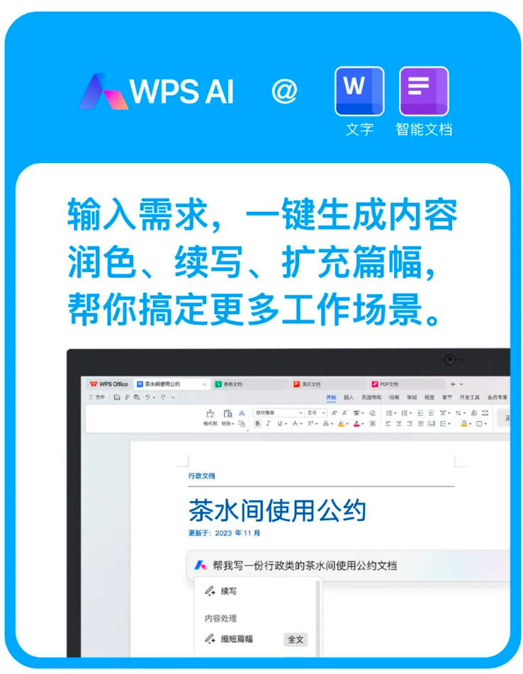 据本站此前报道,WPS AI 已经于去年 11 月 16 日开启公测,面向全体用户陆续开放体验。WPS AI 的功能覆盖文字、表格、演示几个方面,大家可在 WPS AI 官网下载体验。