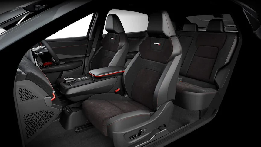 车内同样以黑色为主色调,红色线条点缀,启动按钮一侧印有NISMO标志。新车采用双电机四驱的动力形式,最大功率可选367马力、435马力,分别匹配66kWh、91kWh的电池组。尽管官方尚未公布详细性能信息和续航表现,但据介绍,该车将配备专属的“NISMO模式”,可模拟FormulaE方程式赛车的声浪,车辆性能号称可达最强状态。