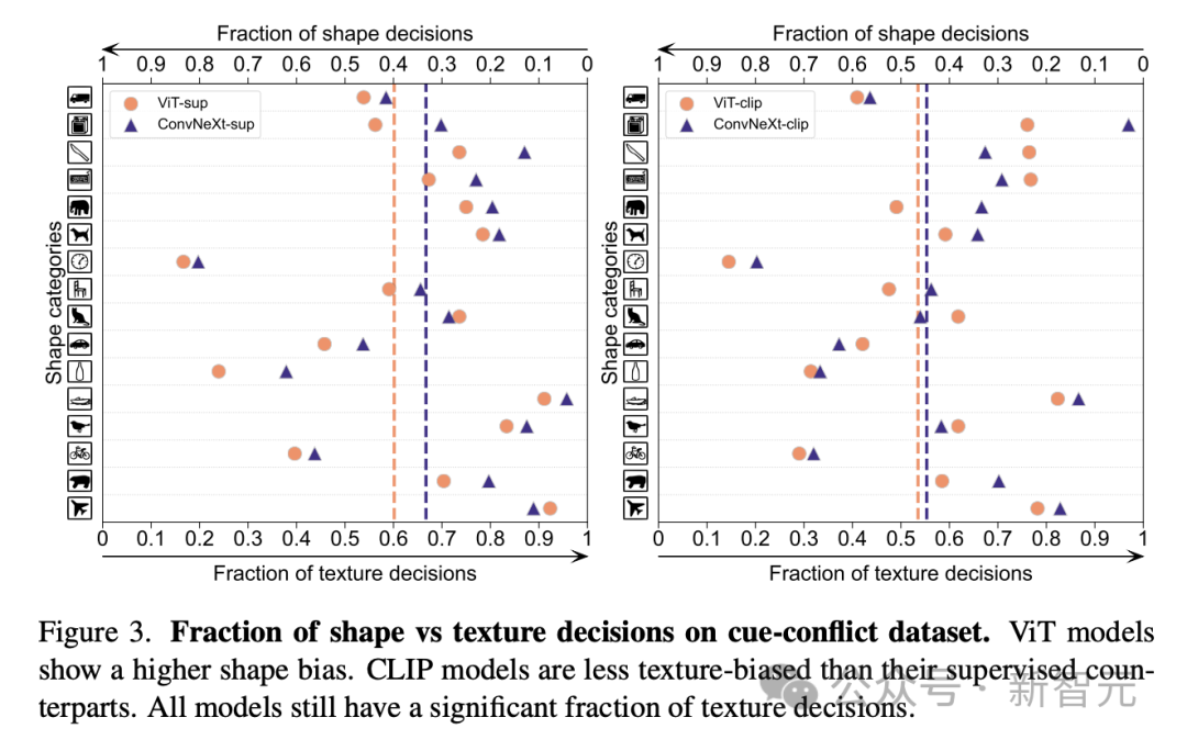 研究人员对提示冲突数据集上的形状-纹理偏差进行了评估,发现CLIP模型的纹理偏差小于监督模型,而ViT模型的形状偏差高于ConvNets。
