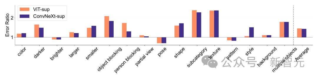 它采用错误率(越低越好)来量化模型在特定因素上,相对于整体准确性的表现,从而对模型错误进行细致入微的分析。ImageNet-X 的结果表明: