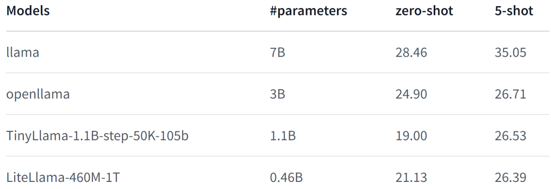 LiteLlama-460M-1T 在 RedPajama 数据集上进行训练,并使用 GPT2Tokenizer 对文本进行 token 化。作者在 MMLU 任务上对该模型进行评估,结果如下图所示,在参数量大幅减少的情况下,LiteLlama-460M-1T 仍能取得与其他模型相媲美或更好的成绩。