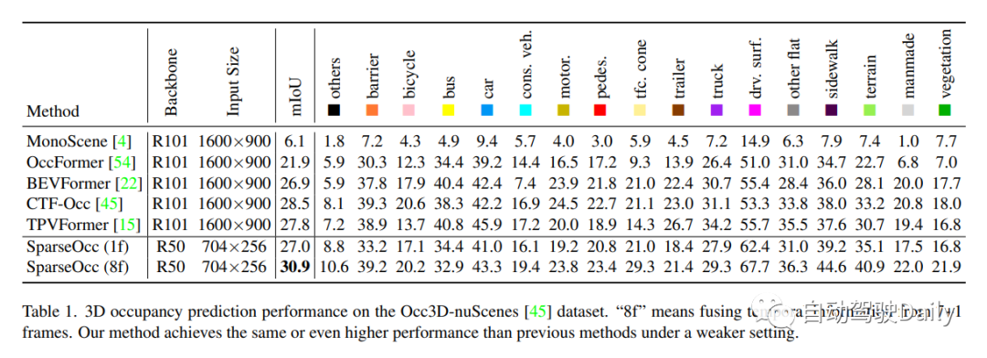 Occ3D nuScenes数据集上的3D占用预测性能。“8f”意味着融合来自7 1帧的时间信息。本文的方法在较弱的设置下实现了与以前的方法相同甚至更高的性能!