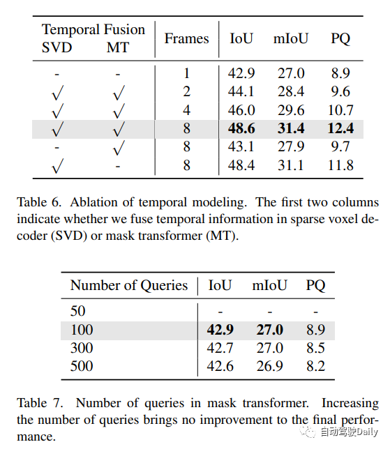 此外,作者还提出了第一个以视觉为中心的全景占用基准——SparseOcc。在Occ3D nus数据集上,SparseOcc实现了26.0的mIoU,并且能够保持每秒25.4帧的实时推理速度。此外,通过结合前8帧的时间建模,SparseOcc的性能进一步提升,达到了30.9的mIoU。作者还表示将在之后开源SparseOcc的代码。