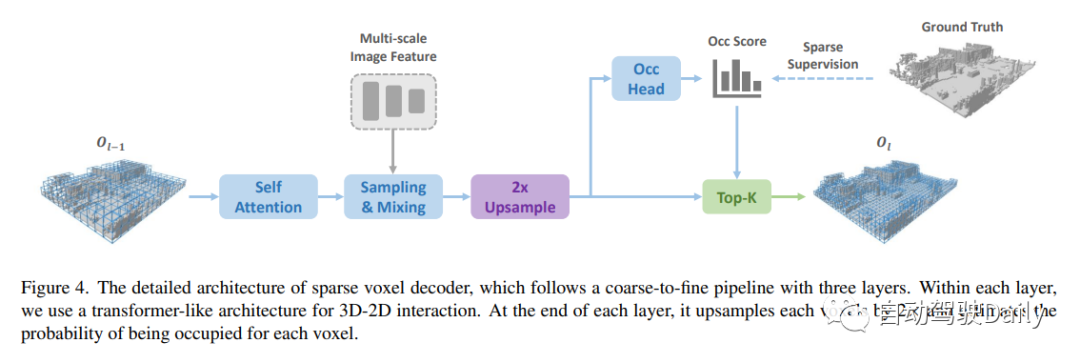 设计的稀疏体素解码器如图4所示。通常,它遵循从粗到细的结构,但采用一组稀疏的体素标记作为输入。在每个层的末尾,我们估计每个体素的占用分数,并基于预测的分数进行稀疏化。在这里,有两种稀疏化方法,一种是基于阈值(例如,仅保持分数>0.5),另一种是根据top-k。在这项工作中,作者选择top-k,因为阈值处理会导致样本长度不相等,影响训练效率。k是与数据集相关的参数,通过以不同分辨率对每个样本中非自由体素的最大数量进行计数而获得,稀疏化后的体素标记将用作下一层的输入!
