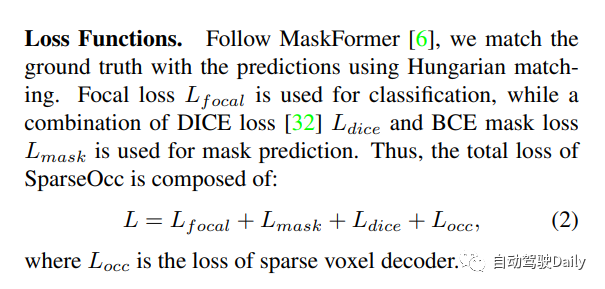 loss设计:对每一层都进行监督。由于在这一步中重建了一个类不可知的占用,使用二进制交叉熵(BCE)损失来监督占用头。只监督一组稀疏的位置(根据预测的占用率),这意味着在早期阶段丢弃的区域将不会受到监督。