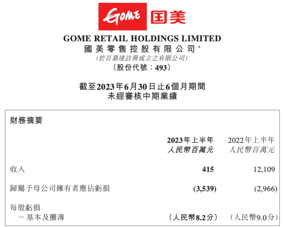 ▲ 国美零售上半年财报 根据国美零售在8月31日发布的财报数据显示,今年上半年,国美零售的营收同比下降了96.57%,从去年同期的121.09亿元降至4.15亿元。