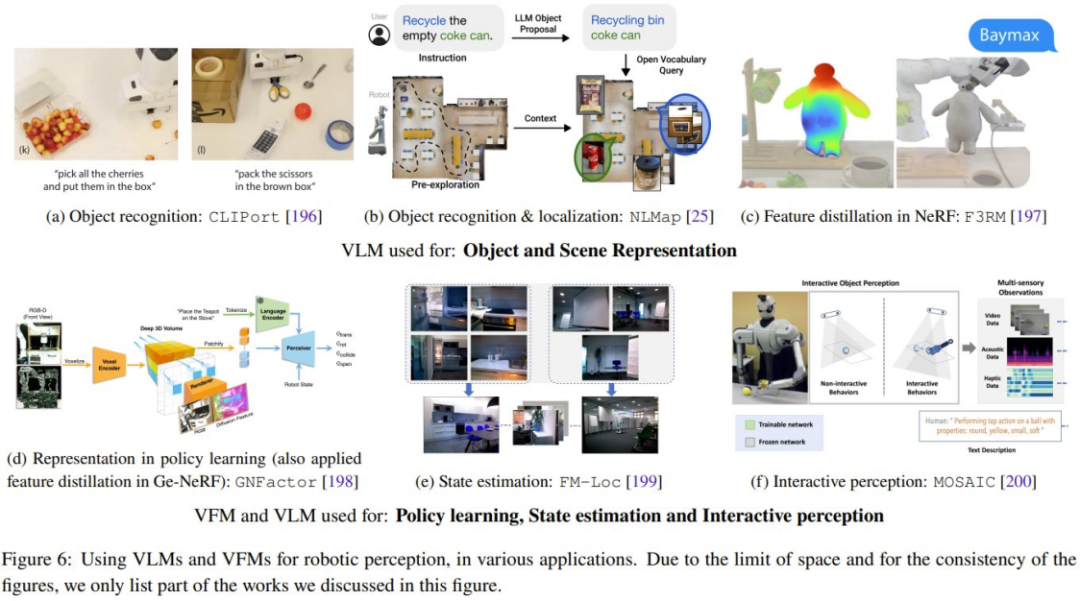 这段内容的重写如下:这部分内容关注于在机器人领域中将视觉和语言基础模型应用到零样本情境。其中,主要包括将VLM零样本部署到机器人感知应用中,以及将LLM的上下文学习能力应用于任务层面和运动层面的规划与动作生成。图6展示了一些典型的研究工作