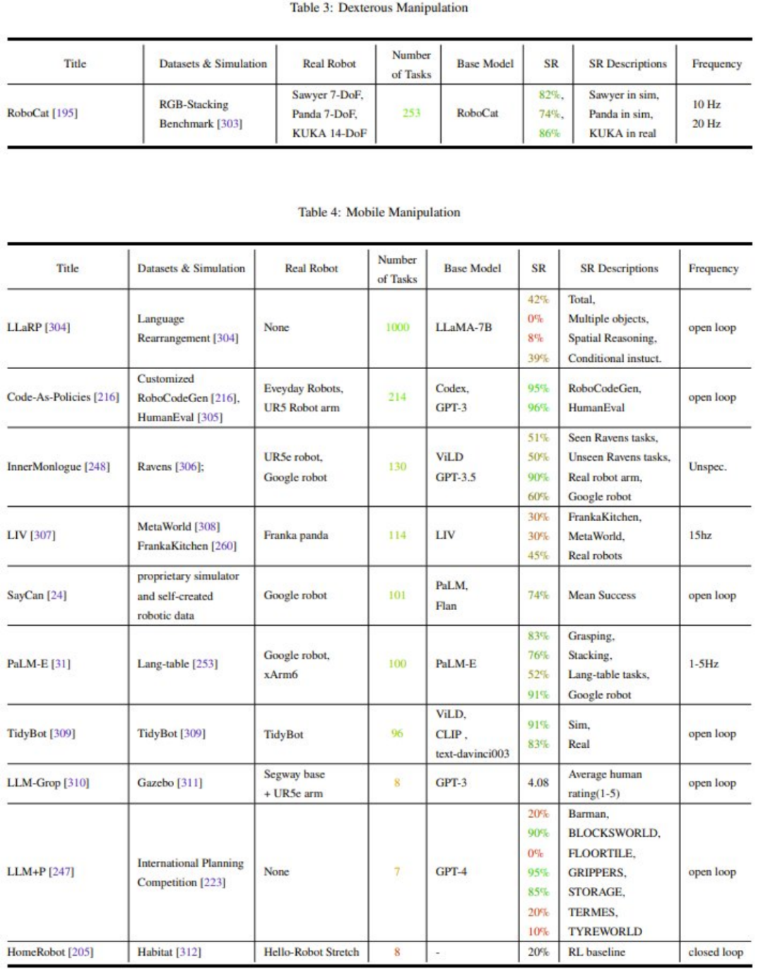 在这篇综述中,研究人员使用的"基础模型(foundation models)"这个术语包含了机器人领域的两个方面:(1) 目前已存在的主要视觉和语言模型,主要是通过零样本和上下文学习来实现;(2) 使用机器人生成的数据专门开发和应用基础模型,解决机器人任务。研究人员总结了相关论文中关于基础模型的方法,并对这些论文的实验结果进行了元分析