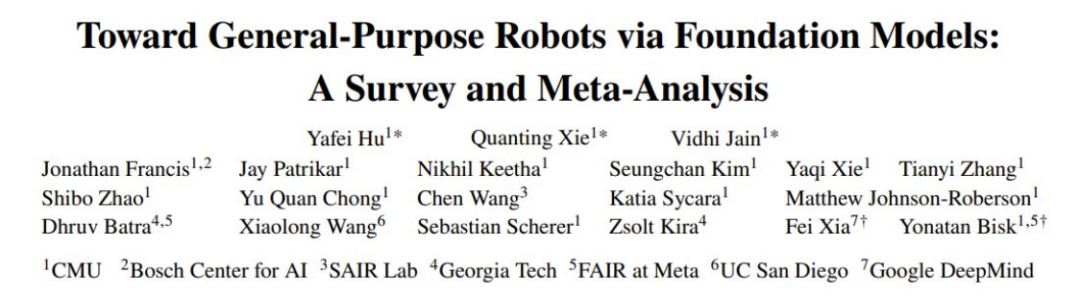 近日,CMU 的 Yonatan Bisk 和 Google DeepMind 的夏斐(Fei Xia)领导的一个联合团队发布了一篇综述报告,介绍了基础模型在机器人领域的应用和发展情况。报告的 first aurthor 是 CMU 的博士四年级学生胡亚非(Yafei Hu),他的研究集中在机器人和人工智能的交叉应用上。与他合作的是谢泉廷(Quanting Xie),专注于通过基础模型探索具身智能(embodied intelligence)。