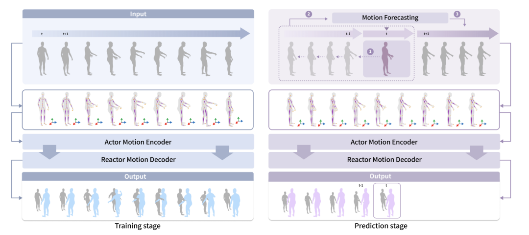 在训练阶段,虚拟人可以观察到人类的所有动作。在真实世界的预测阶段,虚拟人只能观察到人类行为的过去动态。而提出的预测模块可以预测人类将要采取的动作,以提高虚拟人的感知能力。作者使用一个运动预测模块来预测人类行为者的动作和物体的动作。双人交互中,作者使用了 HumanMAC 作为预测模块。在双人与物体交互中,作者基于 InterDiff 构建了运动预测模块,并添加了一个先验条件,即人 - 物接触是稳定的,以简化对物体运动的预测难度。