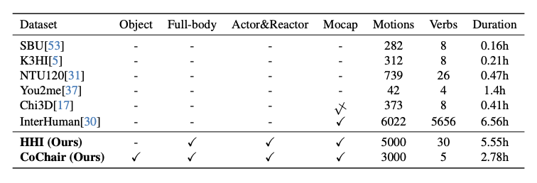 本文中,作者构建了两个数据集来支持在线全身动作反应合成任务。其中一个是双人交互的数据集HHI,另一个是双人与物体交互的数据集CoChair。这两个数据集为研究者们提供了宝贵的资源,可用于进一步探索全身动作合成领域。HHI数据集记录了双人之间的各种交互动作,而CoChair数据集则记录了双人与物体之间的交互动作。这些数据集的建立为研究者们提供了更多的实验