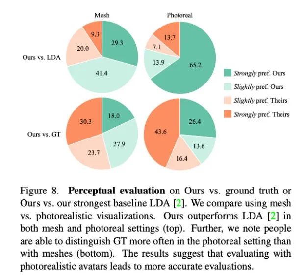 如图 8 所示,本文方法显著优于此前的基线方法 LDA,大约有 70% 的测评人员在网格和真实度方面更青睐 Audio2Photoreal。
