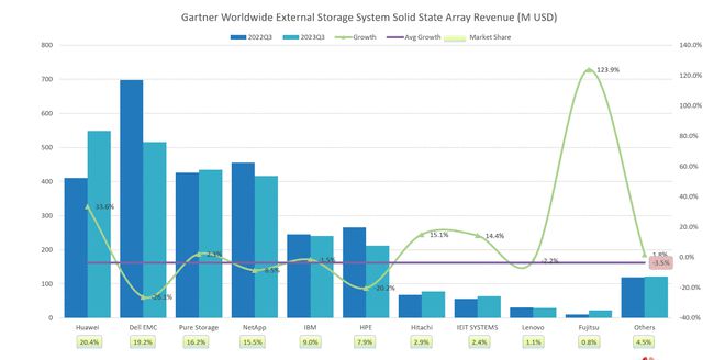 根据Gartner发布的最新外部存储市场报告,华为在2023年第三季度全闪存(SSA)全球市场中取得了巨大的增长,增长率达到了33.6%。与此同时,戴尔的市场份额出现了26.1%的下滑。这是史上首次华为超过戴尔成为全球全闪存市场份额季度第一。