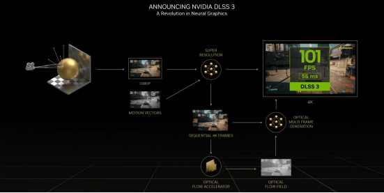 DLSS 3以超分辨率、DLAA为基础增加了帧生成技术:利用AI技术生成更多的帧,以进一步提高性能。当我们在游戏中开启DLSS3后,游戏渲染分辨率降低,运算压力也就变小了,AI就会智能的根据当前的图像以及之前渲染好的图像,自动运算构建出在高分辨率下的画面。DLSS 3技术中还包括了Reflex技术,能通过动态优化图像渲染指令和队列,从而降低CPU在渲染队列时带来的压力,有效降低游戏的响应延迟。关于Reflex技术之后我们也会详细提到。